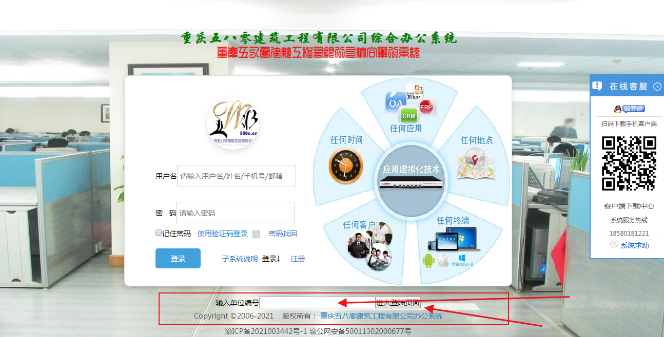 7、您也可以直接在http://oapm.580c.cn登录页面底部(输入单位编号)处输入单位代码编号后点击(进入登录页面),然后登陆就可以了。